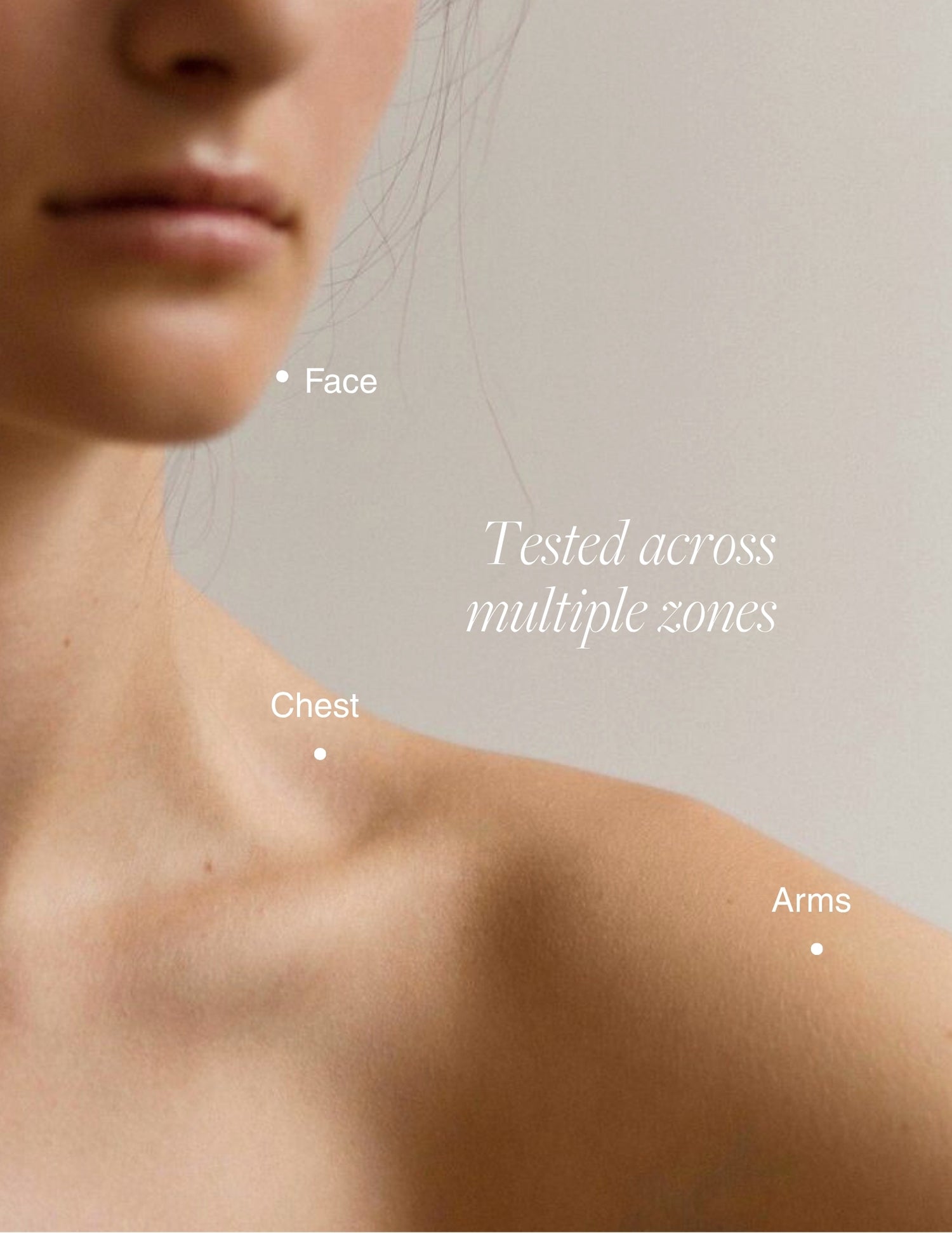 To ensure real-world performance, our formulas are clinically tested across multiple skin zones: face, chest, arms.